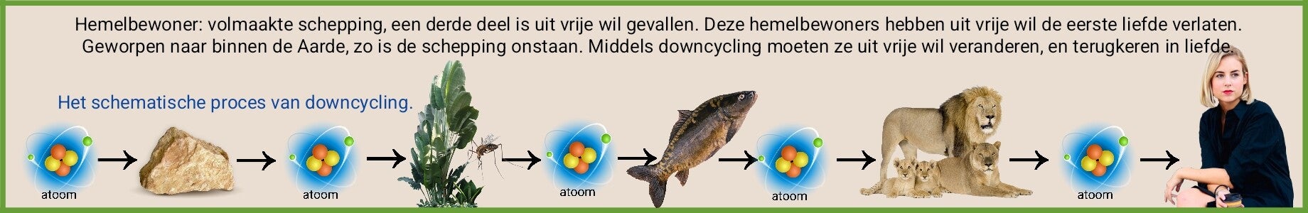 Bij christelijke begrafenissen is het zelfs een standaard uitspraak: aarde tot aarde, stof tot stof. Ik ben ervan overtuigd, jij mag een andere overtuiging hebben, dat de gevallen engelen zijn opgedeeld in uiterst kleine deeltjes, dus dat de volwaardige hemelse lichamen in een lang proces van downcycling hun weg moeten gaan. Deze weg stimuleert veranderingsgedrag. Een verandering die in een sterfelijk mens noodzakelijk is.