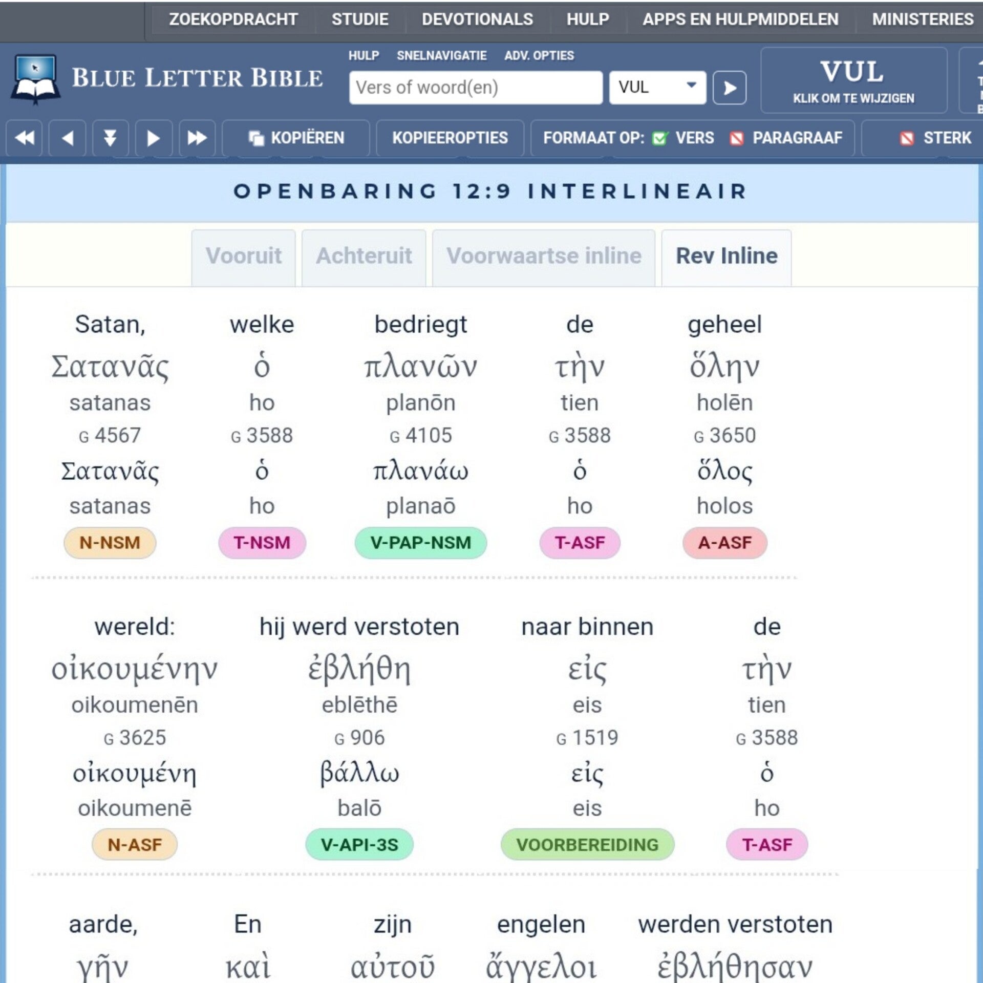 Uit liefde bleef God niets anders over dan een juridische ingreep: Psalm 82:5-7 God veroordeelde de ‘goden’ om te sterven als een mens. Deze goden – de gevallen engelen – werden geworpen naar binnen de aarde. Nederlandstalige bijbels hebben het over ‘op’ de aarde, maar de KJV zegt in Openbaring 12:9 into the earth. Op blueletterbible.org (vertaling vanuit de grondtalen) wordt Openbaring 12:9 ook vertaald met NAAR BINNEN de aarde, zie de hiernaast staande afbeelding.