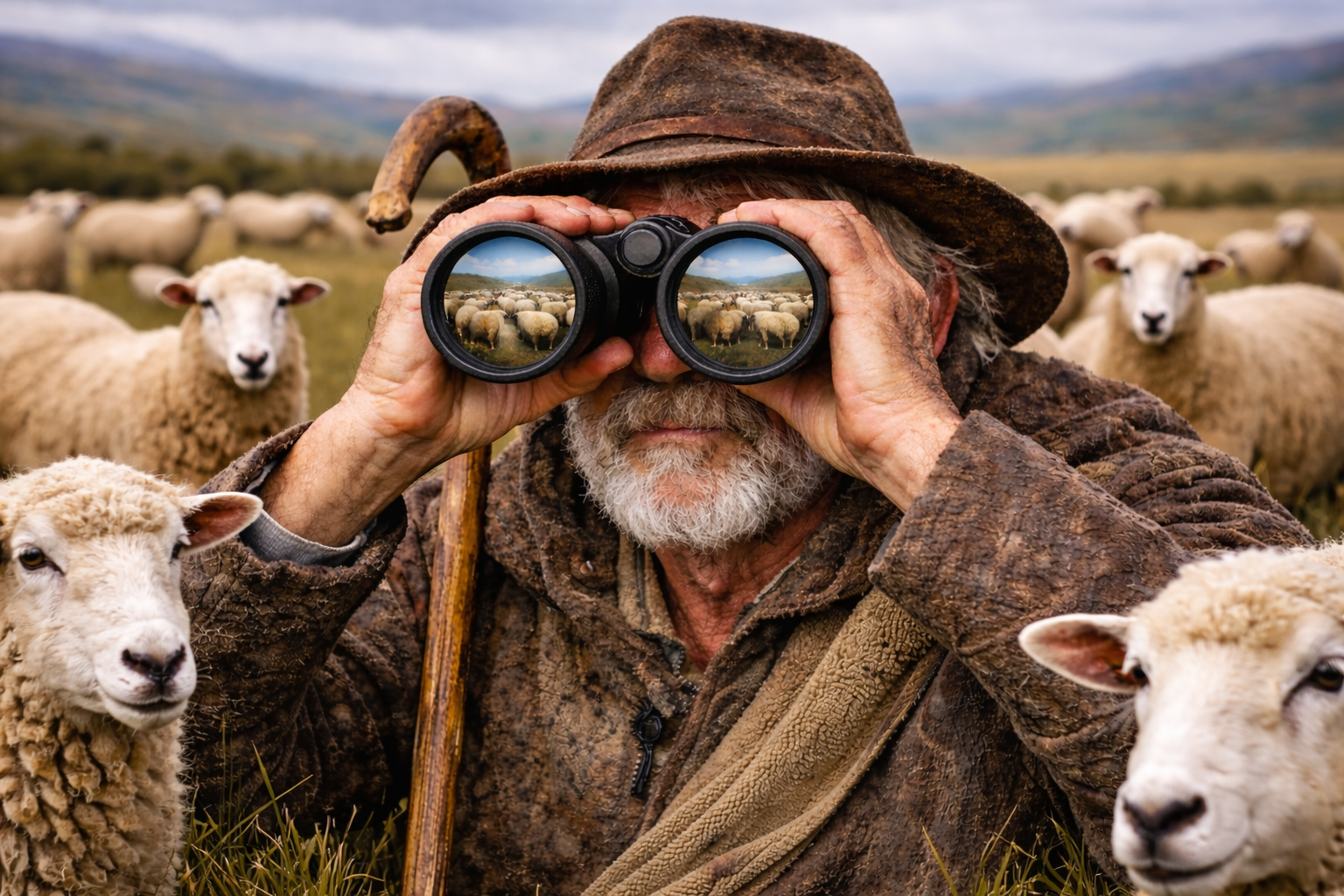 Zie je het voor je? De herder is op zoek, nou ja, op zoek, volgens de afbeelding heeft hij de tweede kudde al in beeld. Je ziet die kudde al gespiegeld in zijn verrekijker.