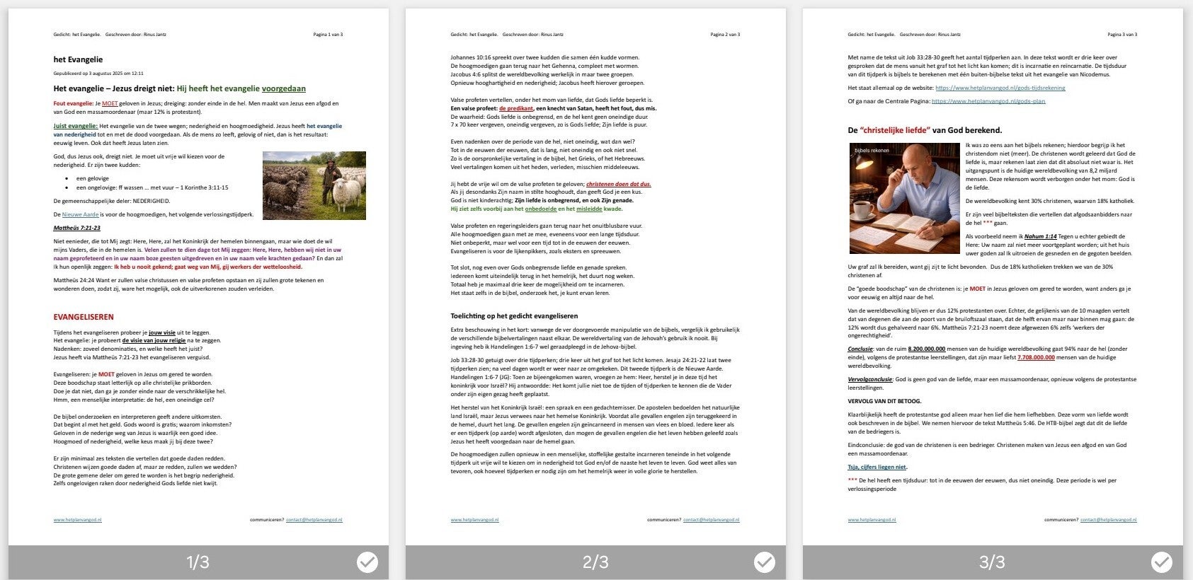 Fout evangelie: Je MOET geloven in Jezus; dreiging: zonder einde in de hel. Men maakt van Jezus een afgod en van God een massamoordenaar (maar 12% is protestant). Juist evangelie: Het evangelie van de twee wegen; nederigheid en hoogmoedigheid. Jezus heeft het evangelie van nederigheid tot en met de dood voorgedaan. Als de mens zo leeft, gelovig of niet, dan is het resultaat: eeuwig leven. Ook dat heeft Jezus laten zien.